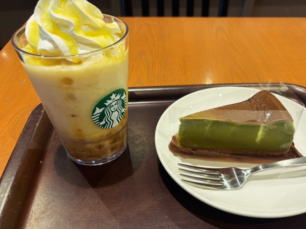 ちなみに私が注文したのは「洋なし 生キャラメル フラペチーノ」に店員さんおすすめの洋梨果肉カスタマイズ。そしてスイーツに「宇治抹茶チーズケーキ」